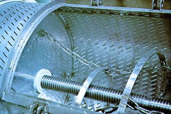 Taj stroj sastoji se od lijevka za prihvat grožđa, rupičastog valjka za odvajanje bobica od peteljkovine i valjaka koji gnječi bobice (sl. 1 i sl. 2)